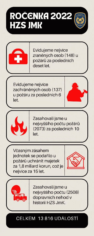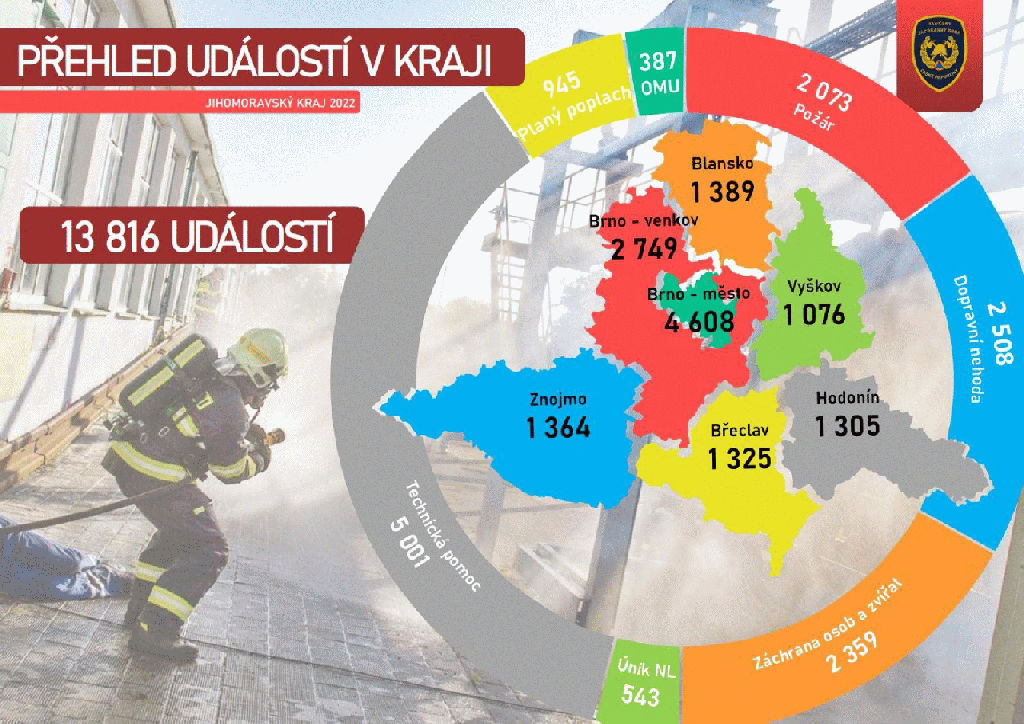 V roce 2022 řešili hasiči o 930 událostí méně, než v předcházejícím roce. Evidují nejvíce zraněných osob (148) u požárů za posledních deset let a nejvíce zachráněných osob (137) u požáru za posledních 6 let. Zasahovali jsme u nejvyššího počtu požárů (2073) za posledních 10 let. Požáry způsobily nejvyšší škodu (406 mil. Kč) za posledních 6 let. Včasným zásahem jednotek se podařilo u požárů uchránit majetek za 1,8 miliard korun, což je nejvíce za 15 let. Zasahovali také u nejvyššího počtu (2508) dopravních nehod v historii Hasičské záchranné služby Jihomoravského kraje. „Další zajímavé informace najdete přímo v ročence a doplňujícím datovém sešitu,“ uvedl mluvčí hasičů Jaroslav Mikoška.