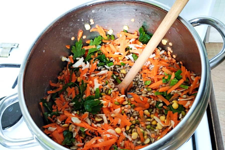 Luštěniny a kroupy namočíme přes noc ve vodě. Před vařením několikrát propereme ve vodě. Než získáme odhad, použijeme raději menší množství surovin, např. od každé uvedené luštěniny a krup malý šálek. Vody dáme asi 2krát více než uvedených suroivn. Osolíme, opepříme a vaříme do změknutí. Občas zkontrolujeme, jestli se voda příliš nevyvařila. Pokud je kaše příliš řídká, zahustíme hladkou moukou.