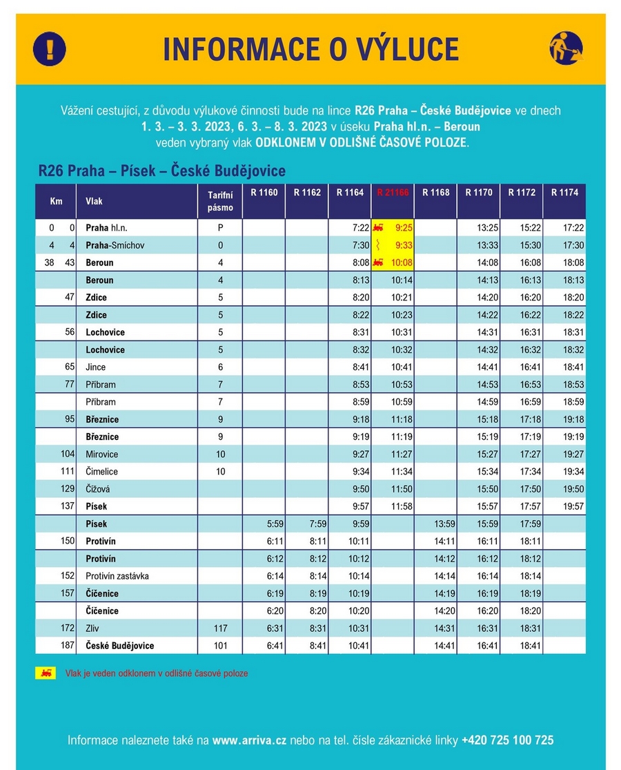 Vybrané spoje vlakové linky R26 v úseku Praha hl. n. – Beroun vedeny odklonem v odlišných časech.