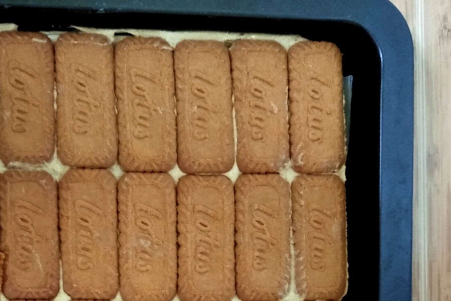 V receptu je použitý pekáček o rozměrech 34 x 23 cm, na který vystačí 6 x 4 Lotus sušenek, asi 2/3 jednoho balení. Formu vyložíme pečicím papírem a na něj naskládáme, těsně vedle sebe, první vrstvu piškotů. Následně navrstvíme krém a položíme druhou vrstvu piškotů, které opět potíráme krémem. Jako poslední vrstvu naskládáme sušenky Lotus. Dodají celému zákusku výbornou karamelovou příchuť. Zákusek dáme uležet do chladu na cca 24 hodin.