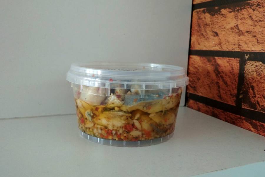 ½ až celé malé balení kořeněných ryb nakládaných v oleji
