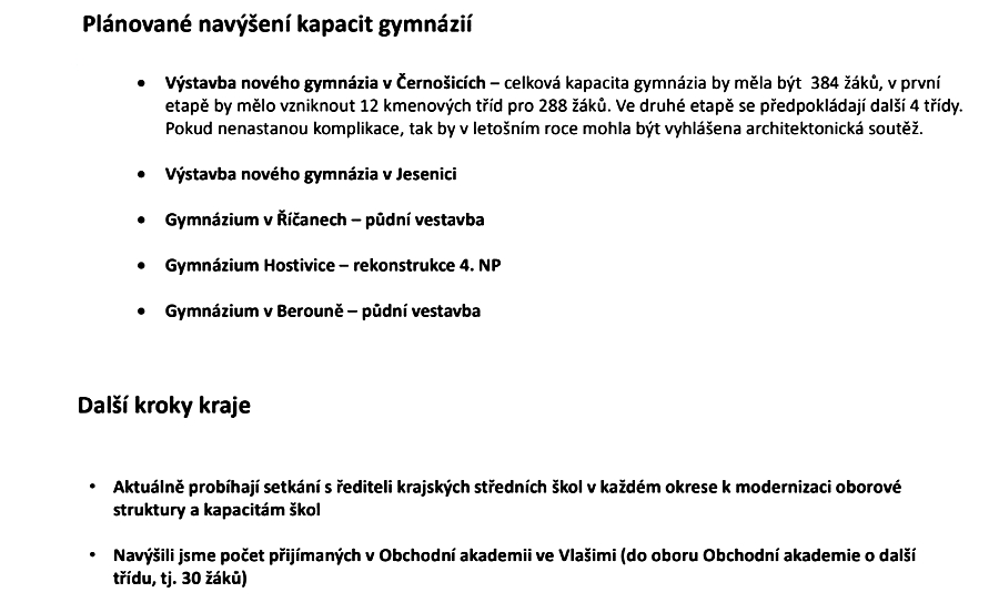 Kraj plánuje postupně zvyšovat kapacity škol, které o to požádají. Zabývá se také modernizací oborové struktury. V rámci setkání s řediteli škol diskutuje o možnostech zvýšení kapacit gymnázií v okresech s větším zájmem.