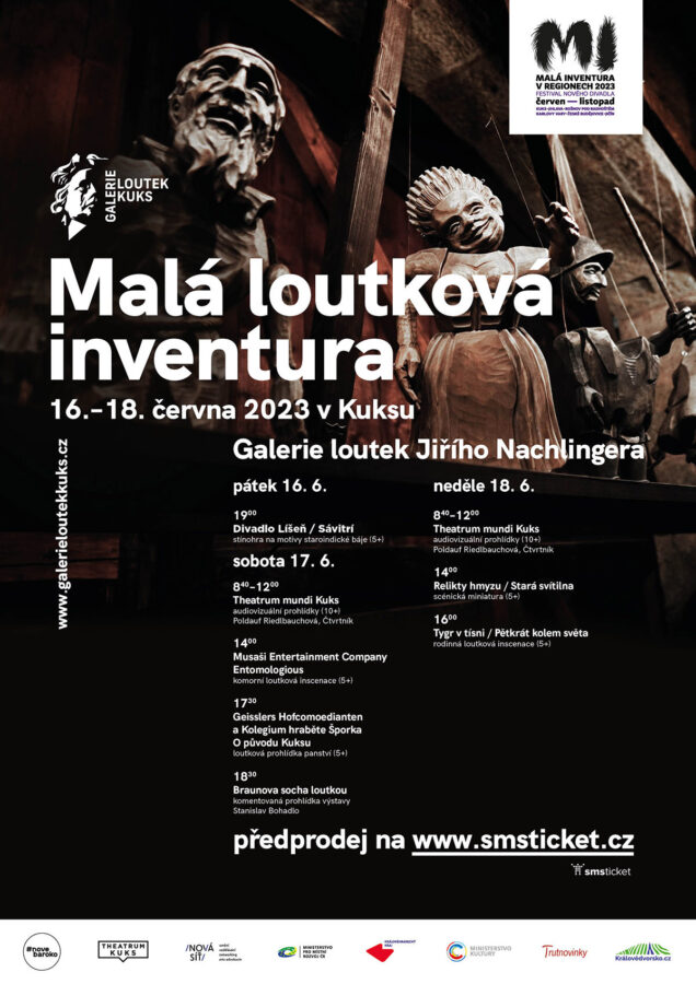 Malá loutková inventura v Kuksu zahajuje svůj program v pátek 16. června a v 19 hodin inscenací Sávitrí Divadla Líšeň. Tento příběh na motivy staroindické báje je loutkovou stínohrou o lásce a síle, překonávající zlý osud. Sávitrí získala u nás i ve světě řadu ocenění. Víkendová dopoledne budou patřit pozoruhodnému zážitkovému audio projektu Veroniky Poldauf Riedlbauchové a Jana Čtvrtníka s názvem Theatrum mundi Kuks. V Galerii loutek se ukrývá 50 ručně vyřezávaných marionet Jiřího Nachlingera, které jsou inspirovány zdejším prostředím a tvorbou Matyáše Bernarda Brauna. Projekt Theatrum mundi Kuks jim vdechuje život, aniž by se jediná loutka pohnula. A to díky zvuku a speciální technologii jeho snímání. Prohlídky je vhodné si rezervovat dopředu z důvodu omezené kapacity. Audio prohlídka v délce 40 min pro vždy jen 4 osoby není vhodná pro děti do 10 let.