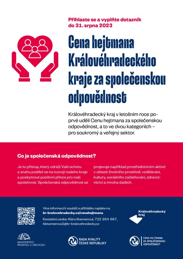 KRÁLOVÉHRADECKO – Kraj spolu s Radou kvality ČR vyhlašuje vůbec poprvé regionální soutěž Cena hejtmana za společenskou odpovědnost. Organizace podnikatelského i veřejného sektoru včetně škol a obcí se mohou přihlašovat do 31. srpna 2023 prostřednictvím internetového dotazníku. Posláním soutěže je ocenit aktéry, kteří jsou v návaznosti na svou činnost regionálně, sociálně, ekonomicky či environmentálně odpovědní a poskytují pozitivní přínos pro společnost.