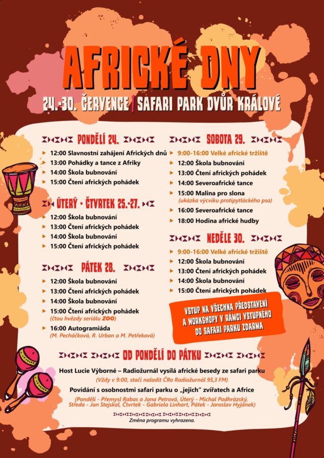 Víkend bude patřit Velkému africkému tržišti. To nabídne od 9 do 16 hodin dobroty, módu, drobné suvenýry a další zboží z Afriky. Nákupem všech dárků a drobností budou lidé podporovat ochranu zvířat v Africe.