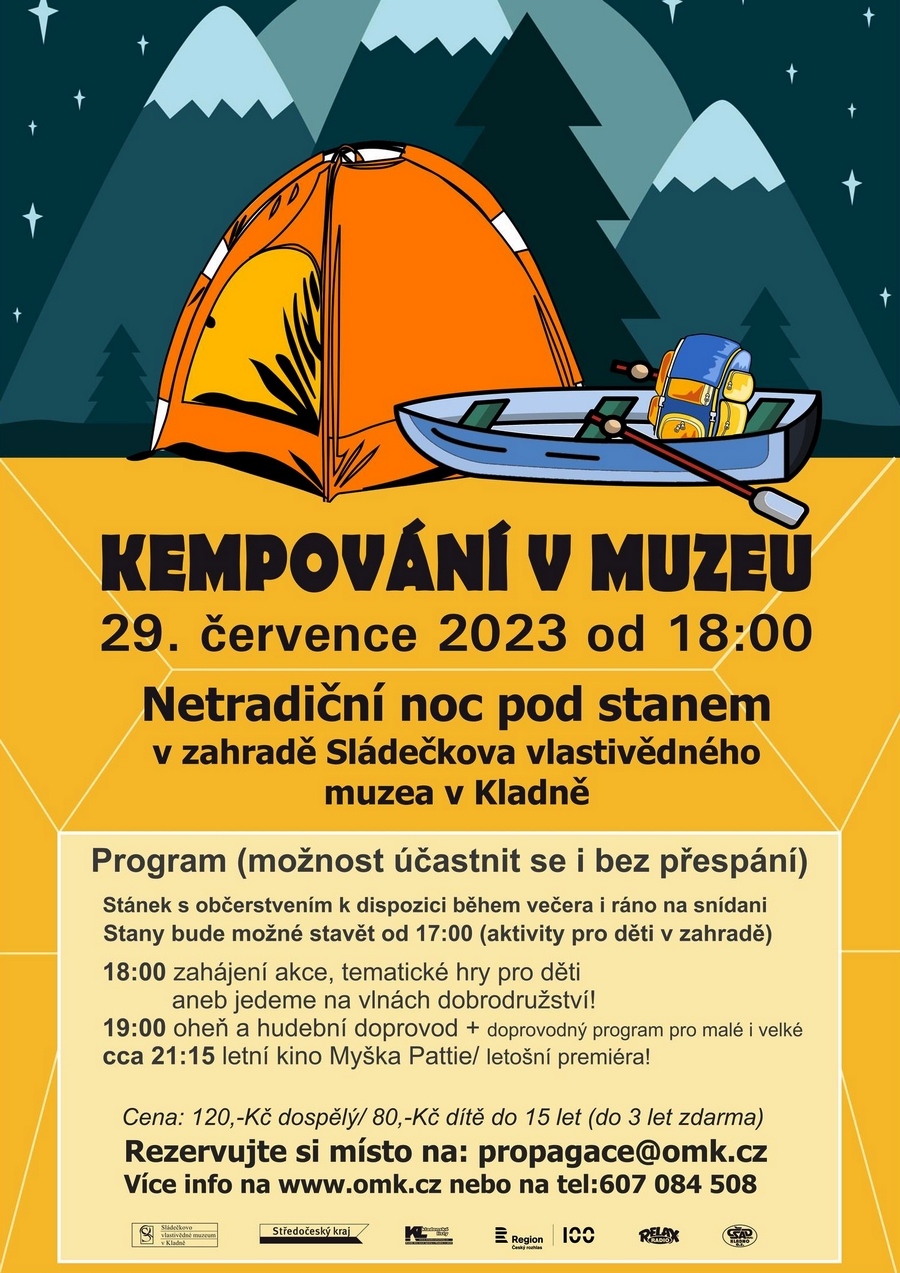 Kempování doprovodí večerní program. Začne v 18 hodin s tematickými hrami pro děti k aktuálním výstavám. Letošní ročník pojede na vlnách dobrodružství s ilustrátorem Václavem Junkem a výstavou Z Kladna až na konec světa.