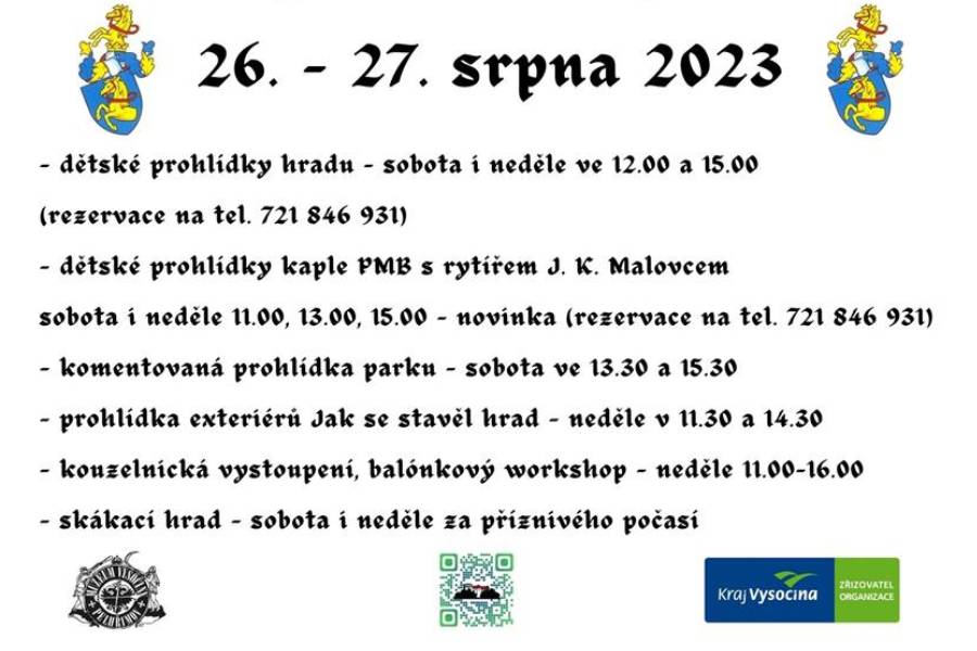 V sobotu se návštěvníci mohou navíc těšit na komentované prohlídky parku, zatímco v neděli je čekají komentované prohlídky na téma Jak se stavěl hrad. Zároveň budou v neděli od 11 do 16 hodin probíhat kouzelnická vystoupení a balónkový workshop. A pokud bude přát počasí, užijí si děti po oba dny i skákací hrad. Dětské prohlídky doporučují organizátoři si předem rezervovat na čísle 721 846 931.