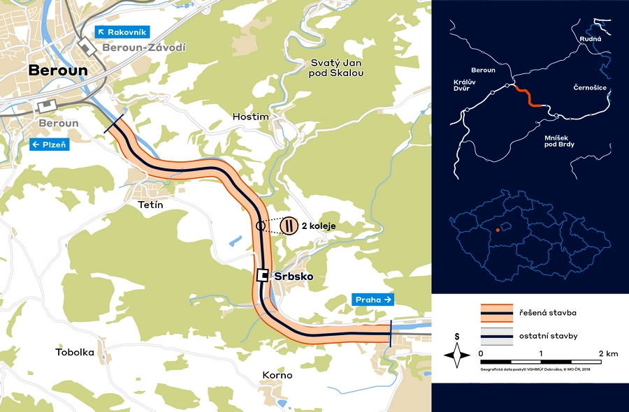 Součástí prací bude i rekonstrukce stanice Srbsko, kde se vybudují nová bezbariérová nástupiště a podchod. Úpravou projde také přilehlý přejezd a zajistí se skály nad tratí u obce Tetín. Vybudování nové odbočky Lom přibližně v polovině traťového úseku přinese vyšší kapacitu trati, a tak i pravidelnější provoz vlaků. Po dokončení stavby se rychlost vlaků zvýší na 100 kilometrů v hodině, po aktivaci evropského zabezpečovače ETCS na 120.