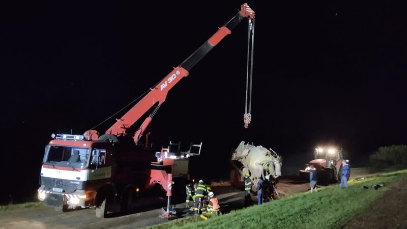 „Obsah cisterny s organickou látkou bylo nutné nejprve přečerpat, až pak se mohly zahájit vyprošťovací práce. Pomocí dvou jeřábů se pak podařilo vrátit cisternu zpět na kola, zásah byl ukončen kolem 21. hodiny,“ sděluje mluvčí hasičů Martina Götzová.
