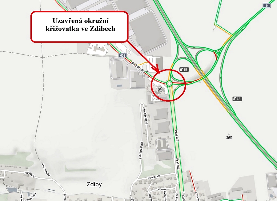 - Zdiby II/608 -> Praha – II/608 -> I/9 -> OK Líbeznice -> I/9 -> D8 Exit 1 -> Praha