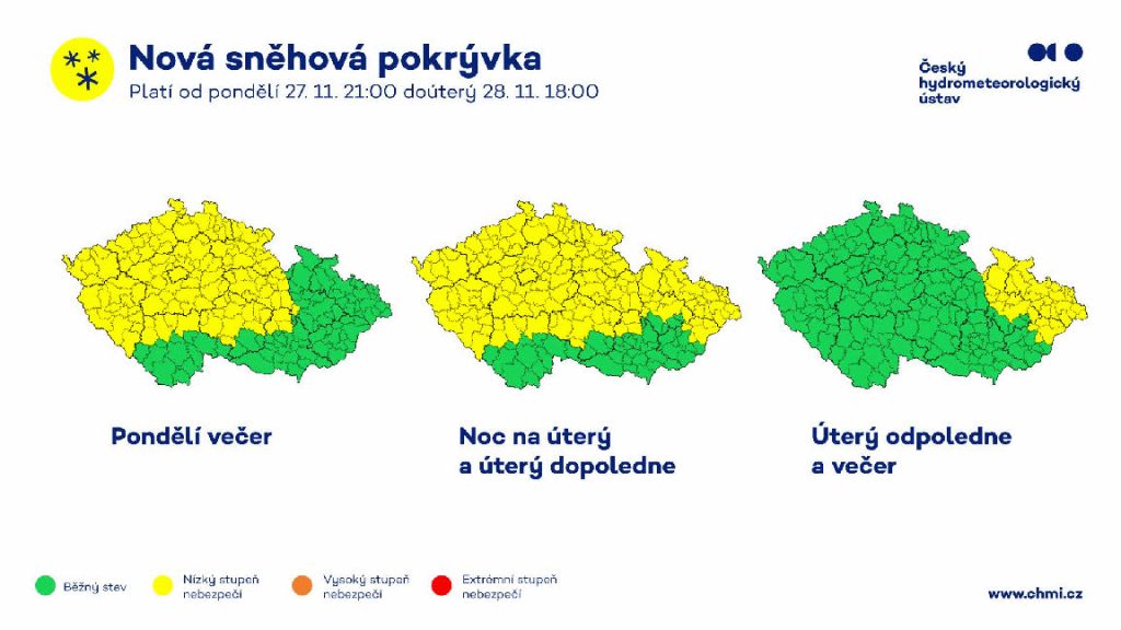 Podle ŘSD jsou dálnice a silnice v Jihomoravském kraji nyní sjízdné bez komplikací. Varování před tvorbou náledí je hlášeno na silnici I/19 u obce Rozseč nad Kunštátem. Podle Českého hydrometeorologického ústavu má v nejbližších hodinách napadat nová sněhová pokrývka. Proto varuje před nebezpečím sněhových jazyků, závějí a náledí. Během noci na úterý se při sněžení vytvoří nová sněhová pokrývka 2 až 10 cm, na horách napadne místy až 15 cm nového sněhu. V nižších polohách bude padat mokrý sníh nebo i sníh s deštěm. Na východě bude sněžit s menší intenzitou a toto množství sněhu napadne během noci a úterního dne. Během úterý odpoledne a večera se nad 600 m nad mořem mohou místy tvořit sněhové jazyky, na horách i závěje. V úterý později odpoledne a večer se při poklesu teplot pod bod mrazu budou vytvářet zmrazky nebo i náledí.