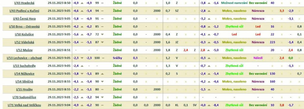 Jak uvedlo Ředitelství silnic a dálnic Jihomoravského kraje, aktuálně jsou dálnice a silnice I. třídy v Jihomoravském kraji sjízdné se zvýšenou opatrností. Hlavní tahy v kraji jsou nyní mokré a chemicky ošetřené. Varování před námrazou a náledím platí pro D52 na 12,8. kilometru a D1 na 234. kilometru, pro silnice I/54 u Silničné a I/55 u Hrušek (viz přehledy). „Jezděte opatrně,“ vyzvalo ŘSD.