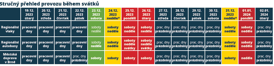 V týdnu od 18. do 22. 12. platí běžné jízdní řády bez omezení. V pátek 22. 12. bude změna v Brně: Linky MD v Brně jedou podle prázdnin! V pracovních dnech od středy 27. prosince do pondělí 2. ledna 2023 budou regionální autobusy a vlaky jezdit podle prázdninových jízdních řádů, tedy nejedou vybrané spoje vyznačené v jízdních řádech. Také městská doprava v Brně pojede podle prázdninových jízdních řádů. Od 3. 1. 2024 platí běžné jízdní řády.