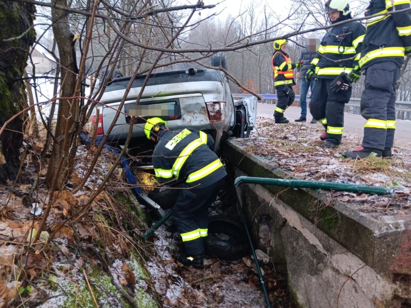 K prvnímu zásahu došlo krátce po osmé hodině ranní v Sedloňově, kam přispěchali profesionální hasiči z HS Dobruška a jednotka dobrovolných hasičů Olešnice v Orlických horách. „Posádka vylezla z vozidla před příjezdem hasičů. Provedli jsme standardní protipožární úkony. Osobní vozidlo jsme převrátili opět na kola a vytáhli na vozovku. Při nehodě došlo ke zničení dopravního značení a konstrukce mostku,“ sděluje Radek Mencl, vedoucí oddělení krajského operačního a informačního střediska HZS. Jedna osoba musela být v péči záchranářů.