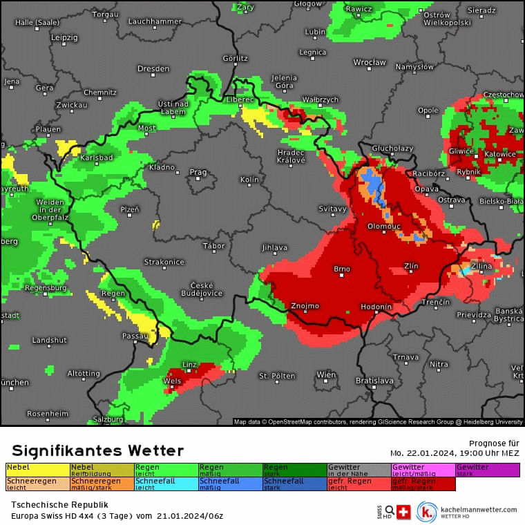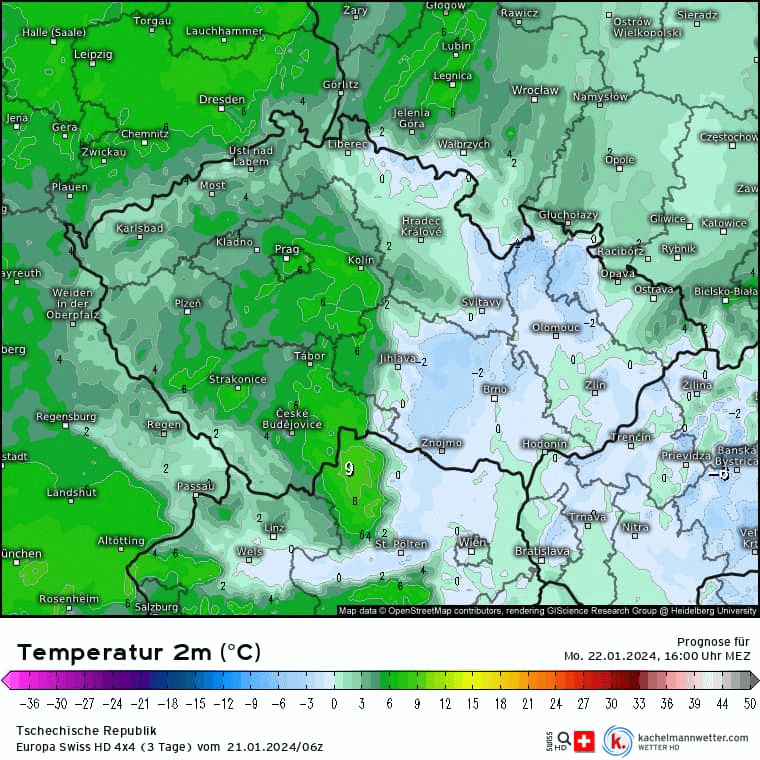 Sinice I. třídy a dálnice v kraji jsou v pondělí podle Ředitelství silnic a dálnic Jihomoravského kraje po ránu suché, vymrzlé, sjízdné se zvýšenou opatrností. Výstraha Českého hydrometeorologického ústavu před tvorbou velmi silné ledovky při mrznoucím dešti platí pro Jihomoravský kraj dnes od 13 do 22 hodin. Doporučuje se sledovat aktuální předpovědi na večer. Na obrázku je model Kachelman, který předpovídá pro celou Moravu mrznoucí déšť s tvorbou ledovky. Na dalším obrázku jsou očekávané teploty ve dvou metrech. „Jak vidíte, na mnoha místech bude mrznout. Jezděte opatrně a šťastnou cestu,“ uvedlo počasí online Morava na své stránce.