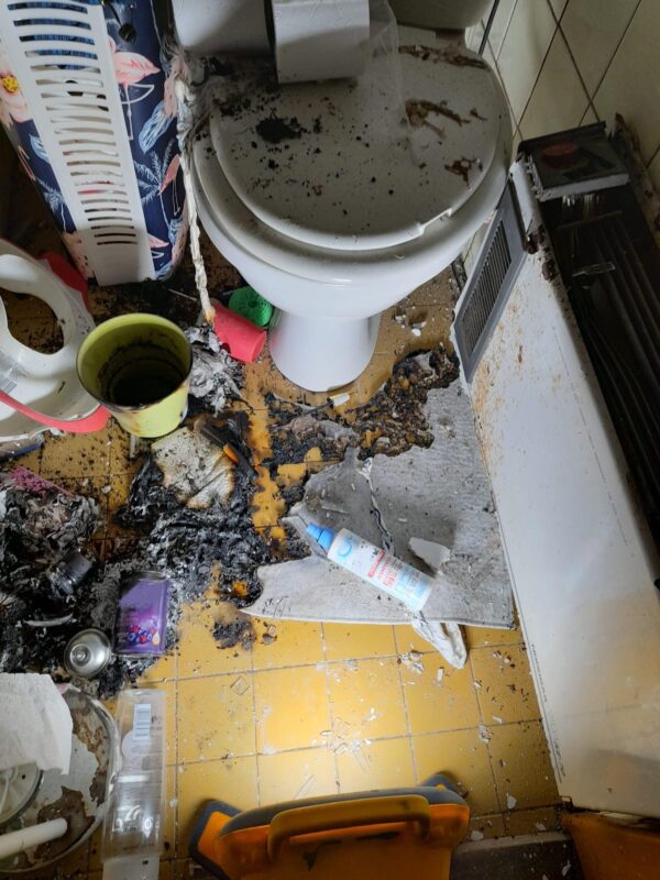 Ti na místě zjistili, že došlo k výbuchu, po kterém byly viditelné praskliny, uvnitř se nacházely další vyražené dveře a v koupelně bylo rozbité okno. Bylo zjištěno, že k výbuchu došlo v koupelně, na zemi byla nalezena roztržená nádoba spreje s voňavou náplní. Zároveň byly v jejím okolí zjištěny stopy hoření u přímotopu.