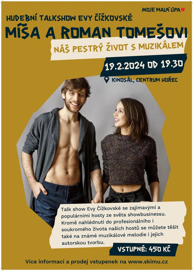 TRUTNOVSKO – Hosty zajímavé show v Centru Hořec v Horní Malé Úpě budou herečtí manželé Míša a Roman Tomešovi. Kromě nahlédnutí do jejich profesionálního i soukromého života se můžete těšit také na známé muzikálové melodie i jejich autorskou tvorbu.