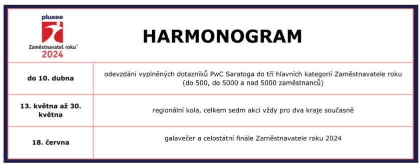 „I v letošním ročníku se budou tituly udělovat v kategoriích do 500, do 5000 a nad 5000 zaměstnanců, a to na celostátní úrovni i v jednotlivých krajích. Chybět nebudou ani vedlejší ceny jako je Cena personalistů za nejlepší HR projekt či Cena za ochranu zdraví. Opět vyhlásíme také Kantýnu roku, která ocení kvalitní zaměstnanecké stravování,“ přibližuje za organizátora soutěže Pavel Hulák, ředitel Klubu zaměstnavatelů a dodává: „Těší nás, že díky transparentnímu a mezinárodně uznávanému způsobu hodnocení každoročně roste počet zapojených firem ve všech velikostních kategoriích v čele s giganty jako Škoda Auto, ČEZ, ORLEN, Plzeňský Prazdroj, Vodafone a desítky dalších, ale také středních a menších firem. Naše soutěž není žádnou anketou, ale opravdu náročnou prověrkou konkrétních číselných ukazatelů jednotlivých účastníků.“