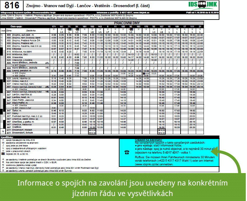 Jak si spoj objednáte: Buď telefonicky na informační linku +420 543174317 volba 1 nebo formou elektronické objednávky prostřednictvím stránky eshop.idsjmk.cz. Tam je zapotřebí být přihlášený. Spoje na zavolání najdete pod symbolem domečku v Ostatních službách. Přehled linek IDS JMK s vybranými spoji na zavolání (nemusí obsahovat všechny linky):