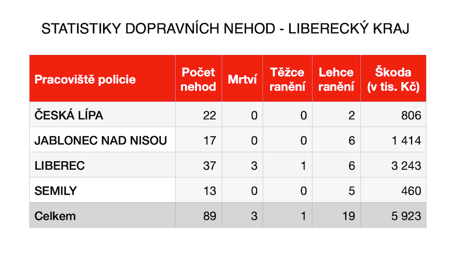 LIBEREC –  Jízda na podzim má svá rizika. Cestu řidičům komplikují mimo jiné brzké stmívání, ranní mlhy, mokré listí na silnicích, častější pohyb zvěře a v některých případech také letní pneumatiky. V týdnu od 28. října do 3. listopadu došlo v Libereckém kraji k 89 nehodám. Tři lidé na silnicích zemřeli a 20 lidí bylo zraněno, z toho jedna osoba těžce.