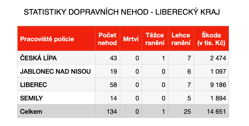 Z policejních statistik dále vyplývá, že se nejvíce nehod stalo v okrese Liberec (58), naopak nejméně v okrese Semily (14). Jako nejčastější příčinu nehod uvádí policie nesprávný způsob jízdy (60), nepřiměřenou rychlost (34) a v devíti případech bylo na vině nedání přednosti. Čtyři nehody zavinili řidiči pod vlivem alkoholu, v jednom případě pak boural řidič pod vlivem omamné a psychotropní látky. V celkem 31 případech se pak dle policie jednalo o příčinu jinou.