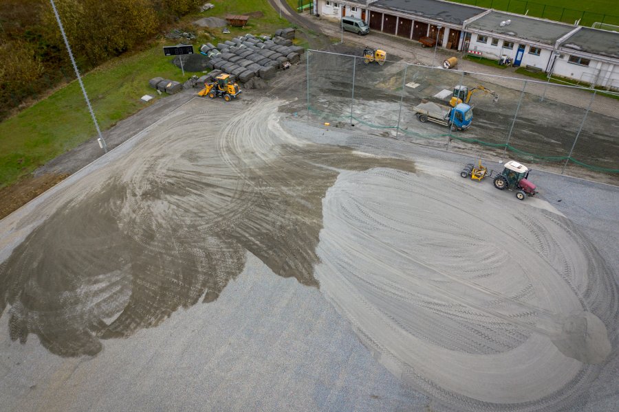 Nejprve bylo nutné odstranit původní umělý povrch, stávající betonové obruby i sportovní vybavení. Na to navázaly zemní práce, které jsou nezbytné kvůli srovnání pláně do roviny. Po srovnání pracovníci osadili betonové obruby, následně položí několik dalších vrstev, z toho poslední bude z mletého lomového kameniva, na níž už přijde umělý trávník se vsypy křemičitého písku a gumového granulátu.