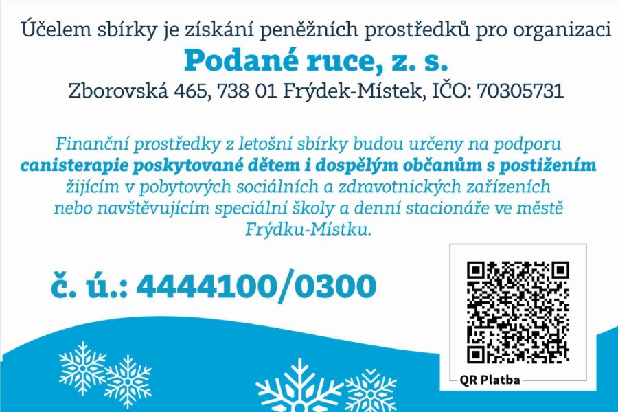 Příspěvky občanů podpoří canisterapii poskytovanou organizací Podané ruce dětem i dospělým s postižením žijícím v pobytových sociálních a zdravotnických zařízeních nebo navštěvujícím speciální školy a denní stacionáře v našem městě. Canisterapie pomáhá zmírnit pocity úzkosti a osamění, navodit pozitivní myšlenky a pocit uvolnění, pocit štěstí a spokojenosti, odbourat negativní myšlením otevřít se komunikaci, adaptovat se na nové podmínky a rozvíjet jemnou i hrubou motoriku.