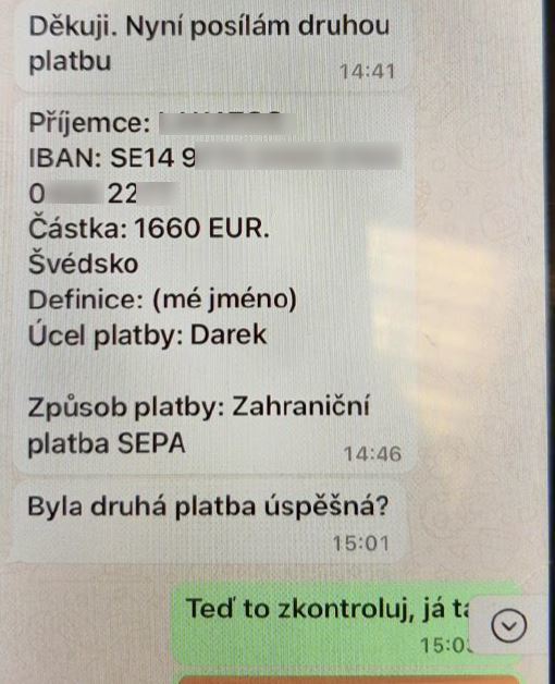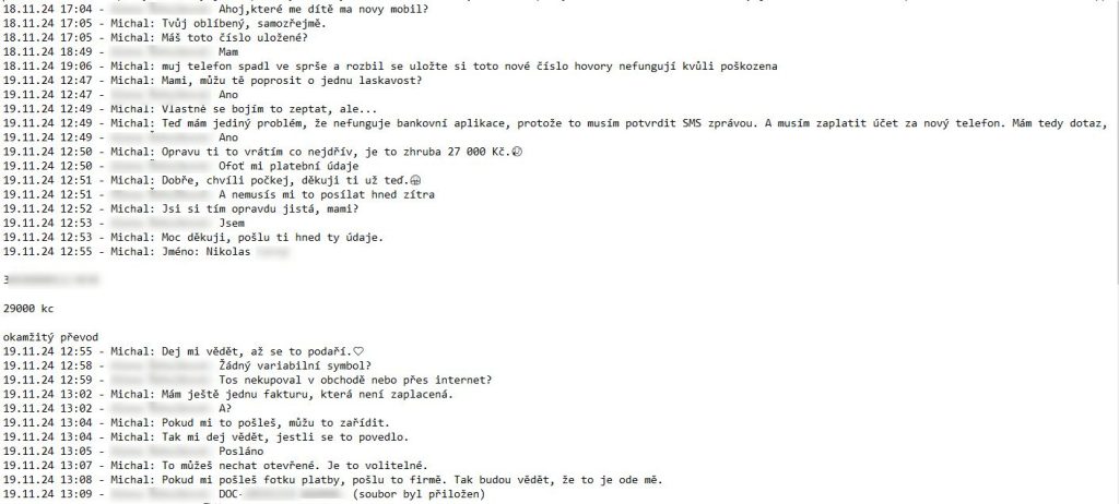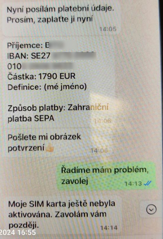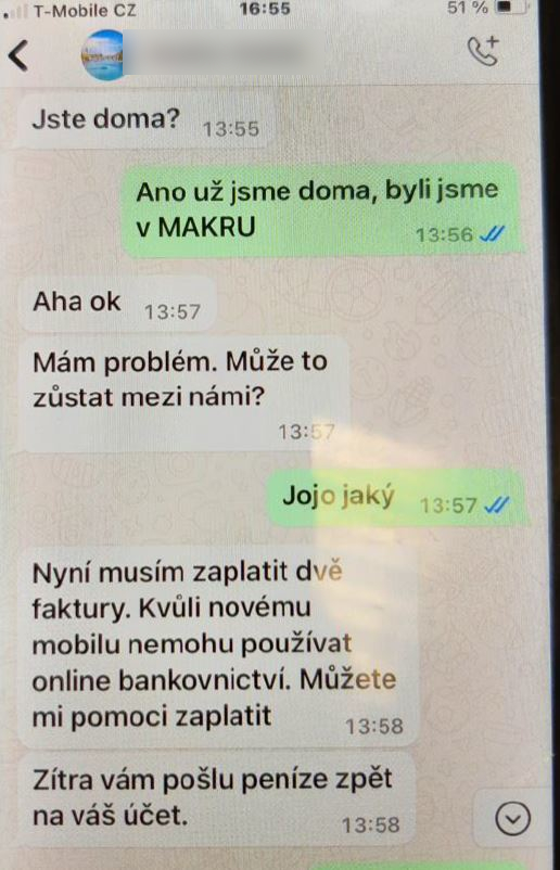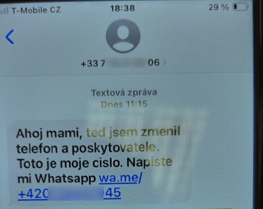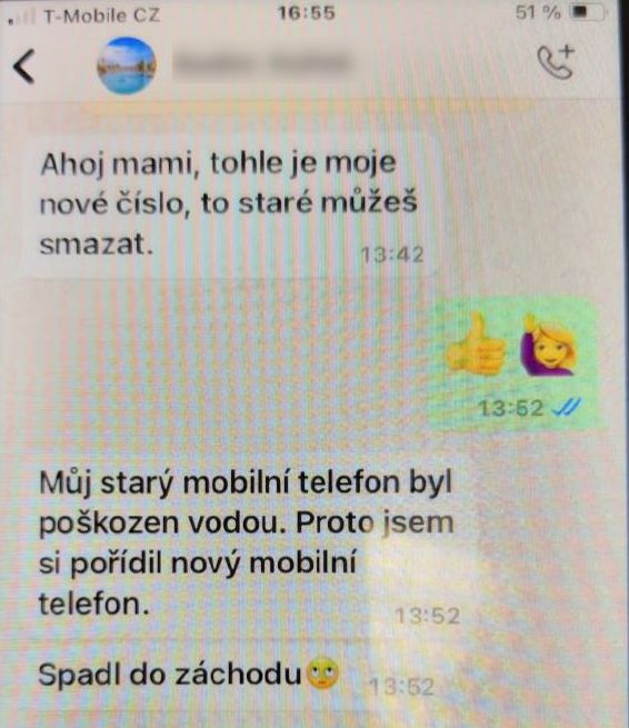 Vše začíná SMS zprávou od neznámého čísla, v některých případech i s cizí státní předvolbou. Pachatelé své nic netušící oběti oslovují mami, tati. „Zpráva pak obsahuje informace, že má pisatel rozbitý telefon, a ať se s ním dotyčný spojí přes WhatsApp skrze uvedené telefonní číslo, které již má českou předvolbu. Legendy o nefunkčnosti telefonu jsou od věrohodných až po méně uvěřitelné. Podvodníci například tvrdí, že telefon spadl do záchodu či se rozbil ve sprše. Jakmile poškození zareagují, tak po krátké konverzaci následuje prosba o zaslání finančních prostředků s tím, že na novém telefonu nemá údajný syn či dcera zřízené internetové bankovnictví a potřebuje nutně něco zaplatit či pomoci v nouzi,“ sdělila mluvčí policie Pavla Jiroušková. Nejvyšší částka, kterou důvěřivý zaslal, přesáhla 140 tisíc korun. „Ve dvou případech si oslovení rodiče ověřili u svých skutečných dětí, jestli jsou v nouzi či potřebují pomoci, což udělali velmi správně,“ uzavřela mluvčí s tím, že upozorňuje, aby lidé byli opatrní a informace si ověřovali.