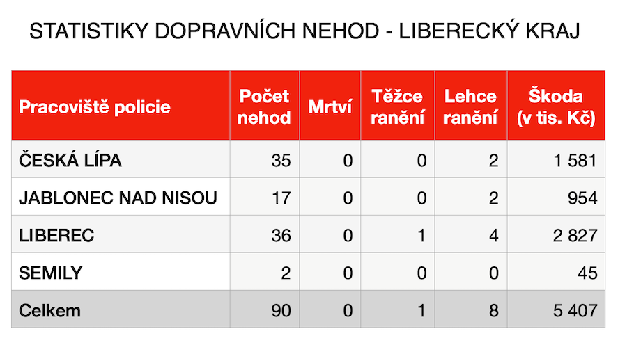 Z policejních statistik dále vyplývá, že se nejvíce nehod stalo v okrese Liberec (36), naopak nejméně v okrese Semily, kde se bouralo pouze dvakrát. Nejčastější příčinou nehod byl ve 45 případech nesprávný způsob jízdy a nepřiměřená rychlost (17). O tři nehody se postarali řidiči pod vlivem alkoholu a ve 24 případech se dle policie jednalo o příčinu jinou.