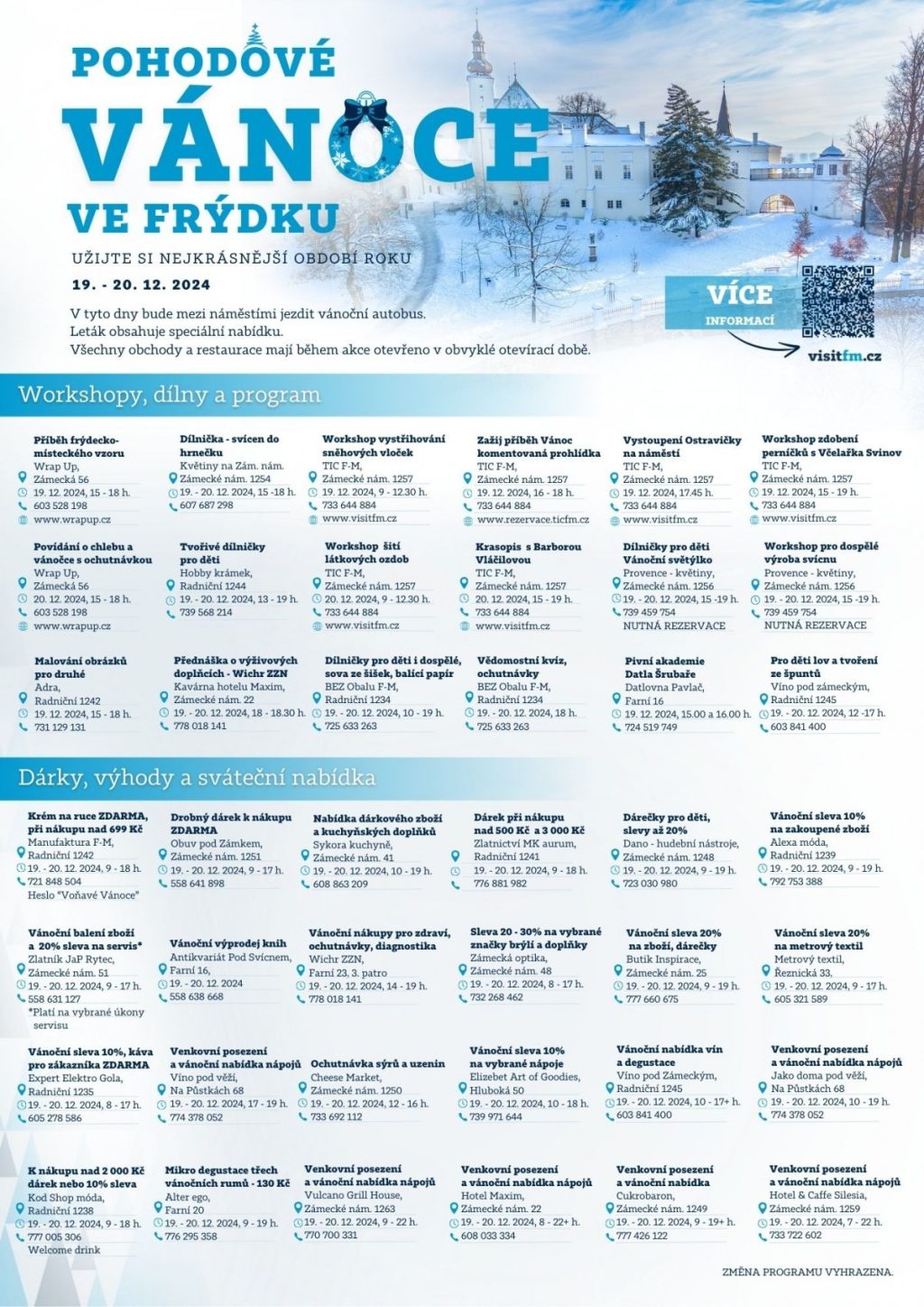 Program se uskuteční ve  čtvrtek 19. a v pátek 20. prosince. Na náměstí nebudou moci vjíždět automobily a bude celé k dispozici lidem, kteří navštíví akci Pohodové Vánoce. Návštěvníci budou moci využít svoz vánočním autobusem, který bude vyjíždět na Zámecké náměstí co půl hodiny mezi 16:00 a 19:00. Zastavovat bude na zastávkách Riviéra, točna – Ostravská – Poliklinika – Sportovní hala Polárka – Železniční stanice – Tř. TGM – Zámecké náměstí.