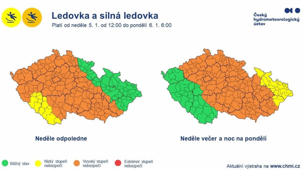 Nedělní počasí bude způsobovat značné komplikace, zejména v dopravě a pravděpodobně i v energetice. Čeká nás sněžení přecházející do mrznoucího deště, při kterém se bude tvořit silná vrstva ledovky. Sněžení začalo kolem poledne na jihozápadě přecházet do mrznoucího deště. Na ostatním území očekáváme přechod do mrznoucích srážek v průběhu odpoledne a večera. Na většině území spadne 2 až 7 mm mrznoucího deště, a tak se bude tvořit silná ledovka. Na jihozápadě Čech vystoupí teploty nad bod mrazu během odpoledne a případná tvorba ledovky skončí. Na severovýchod území dorazí mrznoucí srážky až v neděli večer a celkové úhrny mrznoucího deště zde budou stejně jako na jihozápadě Čech nižší. Srážky budou večer a v noci na pondělí 6. ledna sice od jihozápadu ustávat, ale ledovka bude na některých místech při záporných teplotách přetrvávat i během pondělního dne. Očekáváme výrazné komplikace zejména v dopravě a energetice.