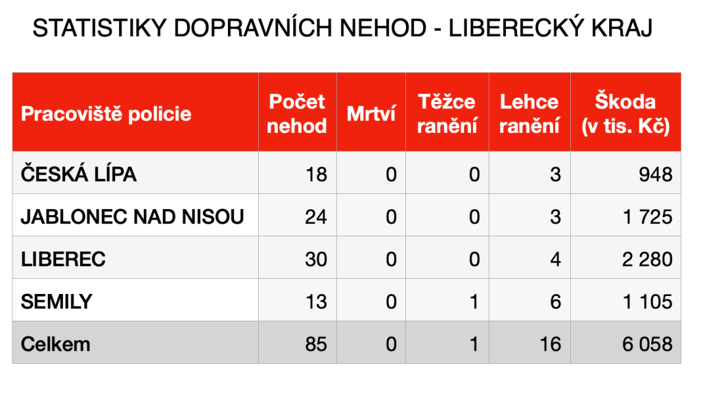 Z policejních statistik dále vyplývá, že se nejvíce nehod stalo v okrese Liberec (30), naopak nejméně v okrese Semily (13). Nejčastější příčinou nehod byl ve 36 případech nesprávný způsob jízdy a nepřiměřená rychlost (27). Čtyři nehody způsobili řidiči vinou nedání přednosti a o pět nehod se postarali řidiči pod vlivem alkoholu. V 18 případech se pak dle policie jednalo o příčinu jinou.