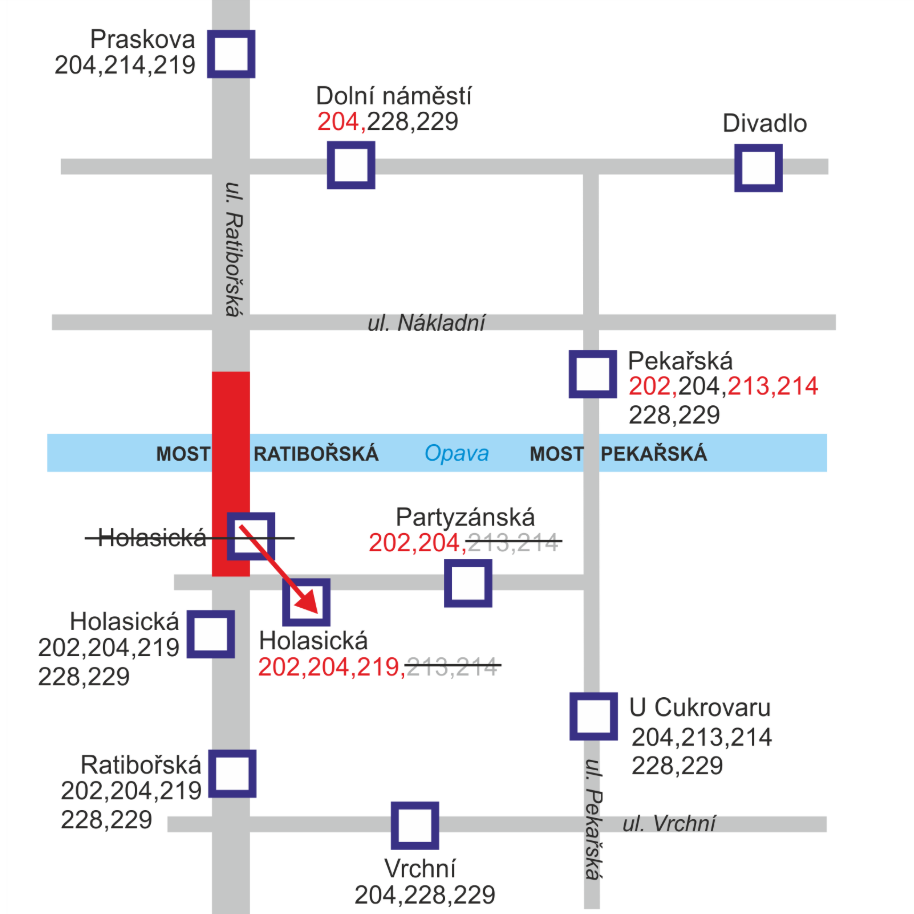 Linka 204 Kylešovice škola – Englišova (změna trasy). Z konečné zastávky Kylešovice škola směr Englišova jede až na ulici Praskovu bez omezení. Ze zastávky Praskova jede po objízdné trase přes Dolní náměstí a pokračuje po ulici Pekařské, Partyzánské, Holasické, Ratibořské, Vrchní, U Cukrovaru, Pekařské k Divadlu a dál po své stálé trase směr ulice Olomoucká. Zastavuje na všech zastávkách dle jízdního řádu včetně zastávek Dolní náměstí, a Partyzánská. Při jízdě z konečné zastávky Englišova do Kylešovic jede přes Kateřinky v opačném směru.