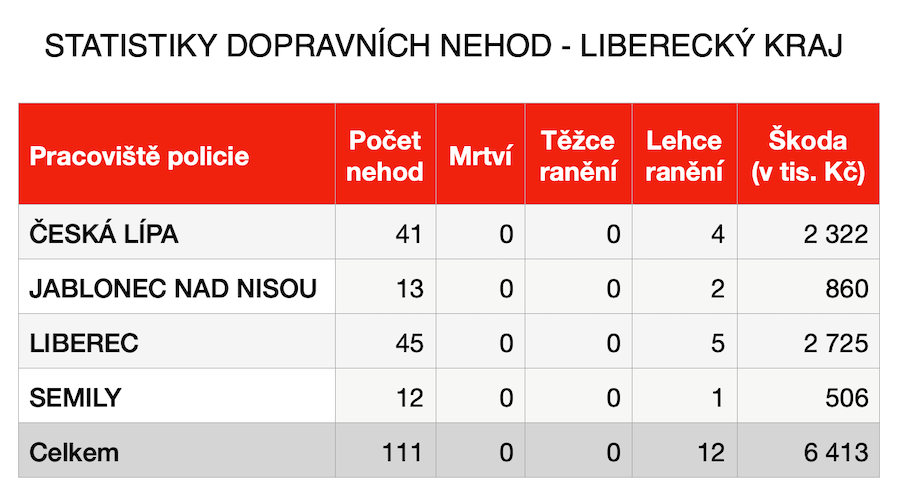 Nejvíce nehod se stalo v okrese Liberec (45), nejméně naopak v okrese Semily (12). Škoda, která na havarovaných vozidlech vznikla, byla předběžně vyčíslena na bezmála 6,5 milionu korun! A pokud vás zajímá, kde byly v minulém týdnu škody nejvyšší a kolik nehod se v jakém okrese stalo, podívejte se na údaje v tabulce níže.