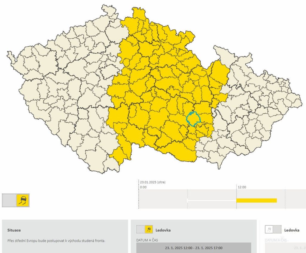 Podle prognózy Českého hydrometeorologického úřadu hrozí ve čtvrtek 23. v čase od 12:00 do 17:00 ledovka v západní části Jihomoravského kraje. Ledovka se bude tvořit vlivem předpovídaných mrznoucích srážek. „Naše týmy zimní údržby jsou v plné pohotovosti. Jezděte zítra opatrně a šťastnou cestu,” uvedlo Ředitelství silnic a dálnic Jihomoravského kraje na síti X.