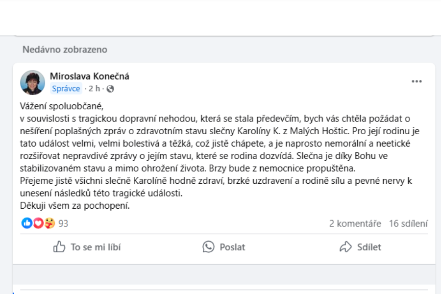OPAVA – Tragická nehoda, která se stala ve středu 12. února na severním obchvatu v Opavě, si vyžádala tři mladé lidské životy. Internetem se začala šířit poplašná zpráva, že účastnice nehody Karolína K. z Malých Hoštic měla zemřít. Fámu naštěstí vyvrátila starostka Miroslava Konečná. Na sociální síti uvedla, že slečna je ve stabilizovaném stavu.