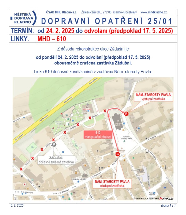 V průběhu rekonstrukce nebude možné daný úsek komunikace používat pro průjezd auty, bude tedy kompletně uzavřen. Naopak parkoviště naproti Stodole zůstane přístupné po celou dobu prací. „Po dobu stavebních prací bude obousměrně zrušena zastávka Zádušní. Linka 610 bude dočasně končit a začínat na náměstí Starosty Pavla,“ upozorňuje radnice na svých webových stránkách.