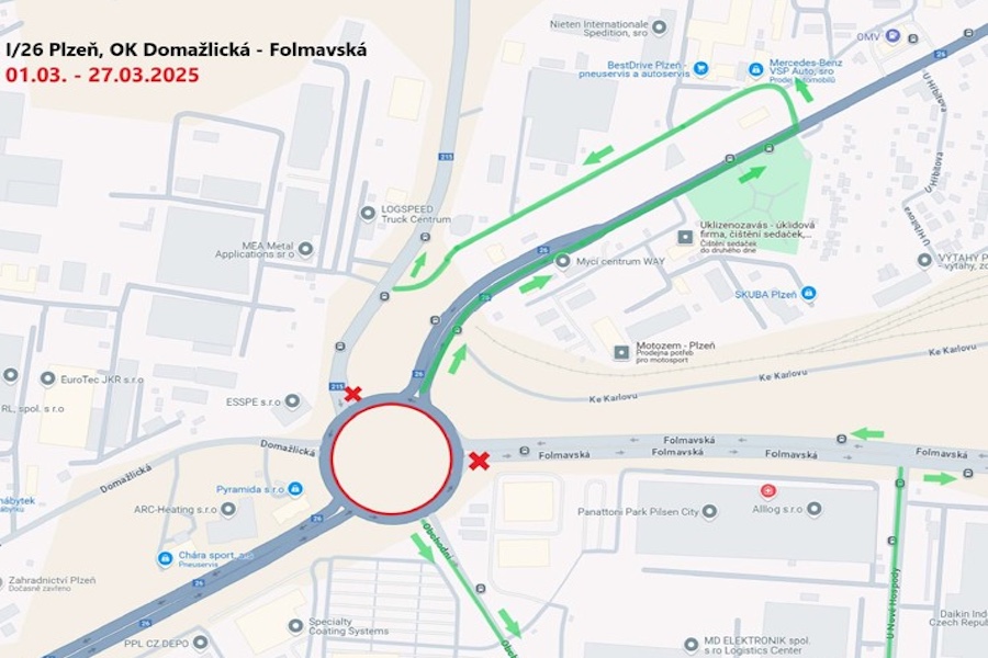 Další uzavírky se budou týkat výjezdu na Regensburskou, který bude zablokován od 1. do 27. března a poté znovu mezi 9. a 30. dubnem. Objížďka povede po I/26, ulicí Domažlická a kolem parkoviště TIR. Na přelomu března a dubna dojde také k desetidenní uzávěře křižovatky před Folmavskou ulicí.