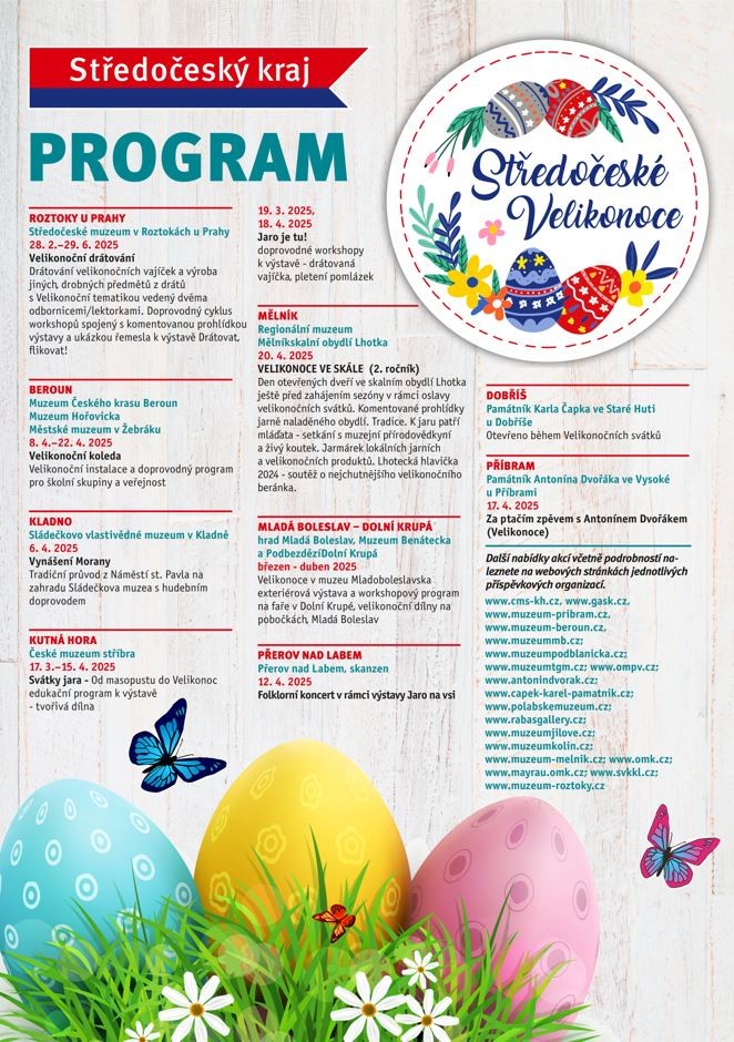 Středočeská muzea a galerie každoročně nabízejí program, který propojuje staré zvyky a tradice s tvořivými aktivitami pro návštěvníky všech generací. „Velikonoční svátky jsou v našich muzeích a galeriích každoročně spojeny s pestrou nabídkou programů pro veřejnost i školní skupiny. Návštěvníci se mohou těšit na rukodělné dílny, tradiční zvyky i folklorní vystoupení. Jsem rád, že kraj může tyto aktivity podpořit a přispět k udržování našich tradic,“ uvedl radní pro oblast kultury, památkové péče a cestovního ruchu Václav Švenda.
