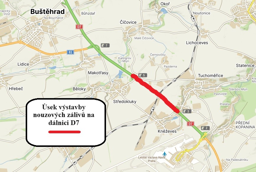 Přípravné fáze výstavby nouzových zálivů na D7 přinesou rozmisťování betonových svodidel, která budou vytvářet bezpečná pracovní místa podél dálničního tělesa a začne 28. dubna. „Půjde o přípravnou fázi, během které budeme především rozmisťovat po stranách dálničního tělesa betonová svodidla a vytvářet tak jednotlivá bezpečná pracovní místa,“ uvedl mluvčí ŘSD Jan Rýdl.