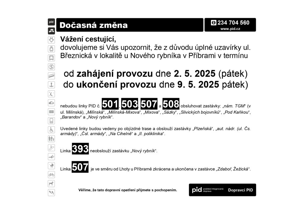 Omezení se dotknou také autobusové dopravy, kde dojde k odklonění linek 393 a MHD 501, 503, 507 a 508. „Na lince 393 se ruší závlek do zastávky Příbram, Nový rybník,“ informovala mluvčí. Linky 501, 503 a 508 budou v úseku mezi náměstím T. G. Masaryka a zastávkou Archiv odkloněny v obou směrech ulicemi Plzeňská, Čs. armády, Březnická, tř. Osvobození a Edvarda Beneše. Linka 507 bude ve směru od Lhoty u Příbrami zkrácena a ukončena v zastávce Zdaboř, Žežická. „Ruší se zastávky Příbram, Nový rybník, Příbram, Barandov, Příbram, Pod Kaňkou, Příbram, Milínská-Mixova, Příbram, Mixova, Příbram, Sázky, Příbram, Slivických bojovníků, Příbram, Milínská, Příbram, nám. T. G. M. a Příbram, Jiráskovy sady,“ uvedla mluvčí a dodala: „Naopak budou zřízeny nové zastávky, například Příbram, Plzeňská ve směru Drkolnov pro linky 501 a 503.“