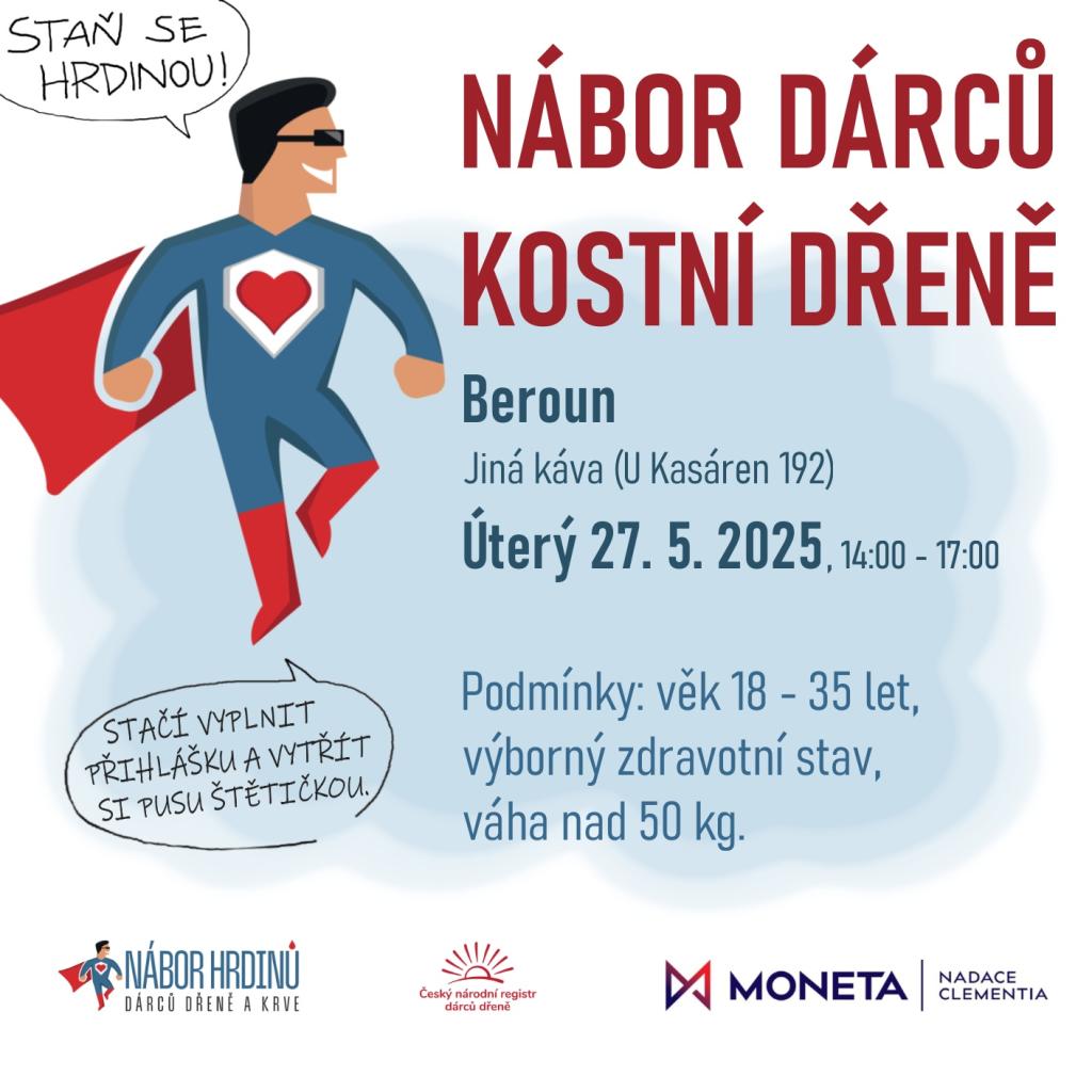 Český národní registr dárců kostní dřeně organizuje nábor nových dárců, který se uskuteční v úterý 27. května od 14:00 do 17:00 v berounské kavárně Jiná káva. Akce je zaměřena na zdravé jedince ve věku 18 až 35 let s hmotností nad 50 kg, kteří mají zájem pomoci zachránit lidské životy.