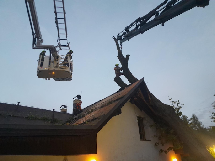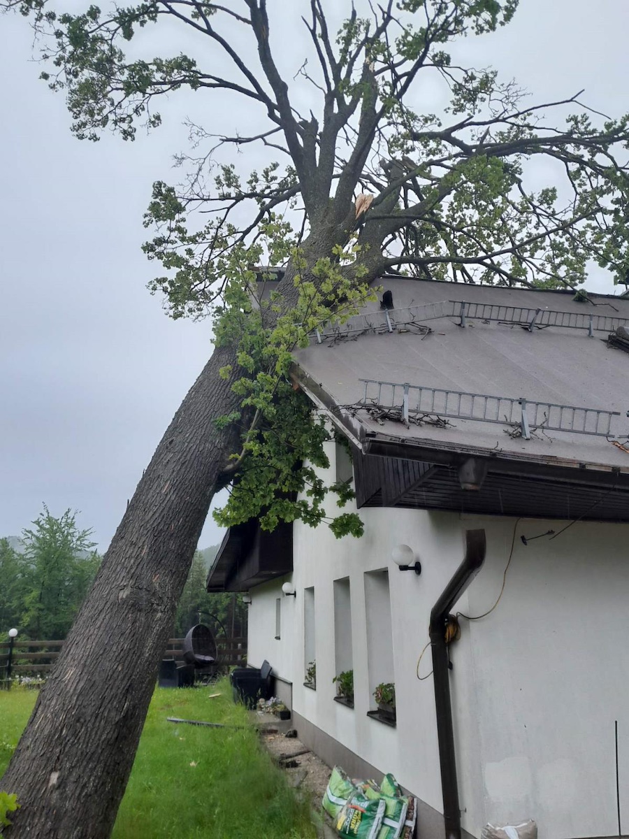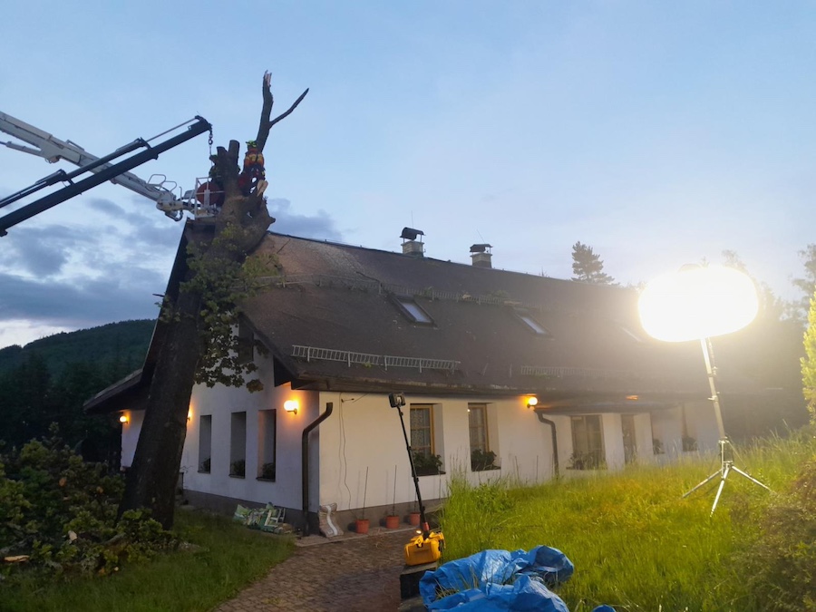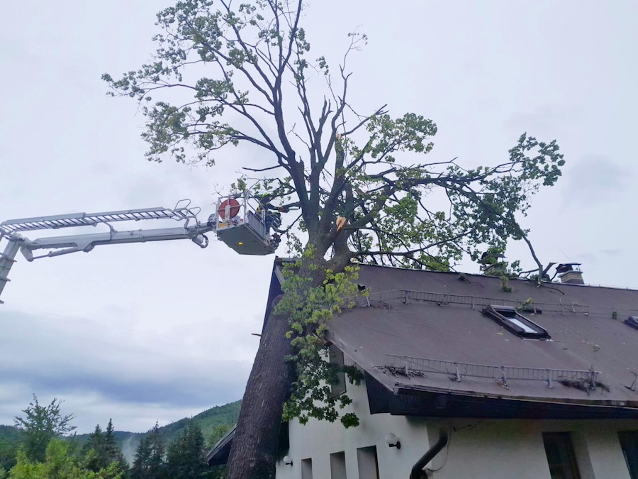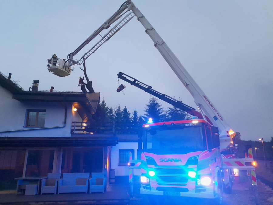 Po odřezání větví koruny stromu hasiči za pomoci navijáku vyprošťovacího automobilu, zbylou část kmene zajistili a bezpečně odklonili na zem, aby nezpůsobila další škody na majetku. „Poškozenou část střechy zasahující provizorně zabezpečili plachtami, aby do střešní konstrukce domu nezatékala voda,“ uvedla mluvčí hasičů.