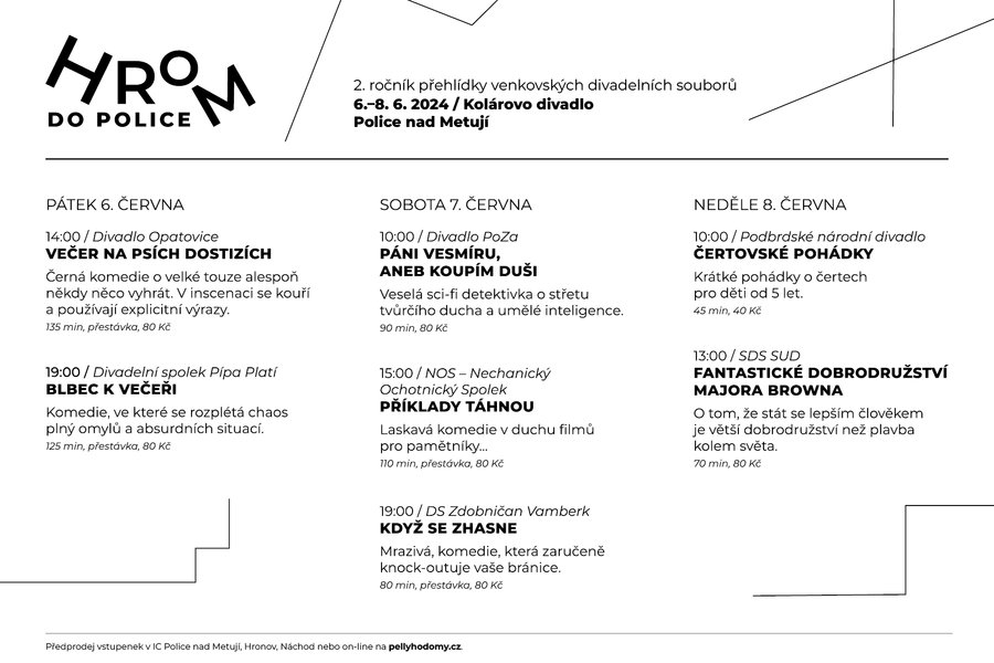 Organizátoři hlásí, že je vše připraveno. „Divadlo se blýská čistotou, po městě jsou vylepené plakáty a zvou na přehlídku a zásoby občerstvení jsou doplněné. Doděláváme drobnosti a těšíme se, až to všechno vypukne,“ vzkazuje Kateřina Fikejzová Prouzová z pořádajícího Centra uměleckých aktivit. Pro diváky má dobrou zprávu: místa je dostatek, takže není třeba spěchat s nákupem vstupenek. Ty jsou navíc za příjemné ceny a k dostání online, v informačních centrech v Polici nad Metují, Náchodě a Hronově, nebo přímo před představením na pokladně divadla.