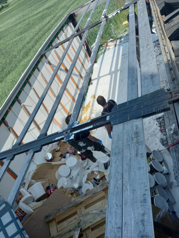 Dopoledne probíhalo třídění nákladu – neporušené balení barev bylo uskladněno na palety, znehodnocené obaly končily v kontejneru na likvidaci. Rozlitá barva byla shromážděna do zapůjčených IBC kontejnerů. Silniční doprava byla po většinu dopoledne řízena kyvadlově.