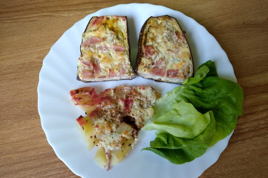 Rozkrojené lilky naplníme, položíme na pekáček vyložený pečicím papírem a dáme zapéct. Do pekáčku můžeme také nakrájet na středně hrubé plátky syrové brambory, které jemně osolíme a posypeme drceným kmínem. Tak si ušetříme nádobí i práci, a hlavní chod i přílohu připravíme najednou. Zapékáme na 180 °C přibližně 35 až 45 minut.