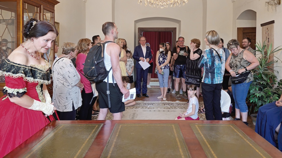 V půlhodinových intervalech bylo pak možné podívat se na zámeckou věž, z níž byl díky slunečnému počasí velmi hezký výhled. „Před zámkem návštěvníci prošli tržiště s historickým pečivem, stánky s tvorbou z rybích šupin, mohli přijít za kovářkou, za perníčky či za drahými kameny a šperky, občerstvit se u stánku Jídelny nebo si dojít na kávu ke stánku Jedno kafe,“ popsala mluvčí radnice Jana Kodymová.