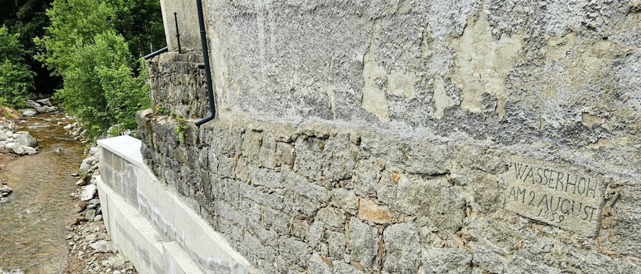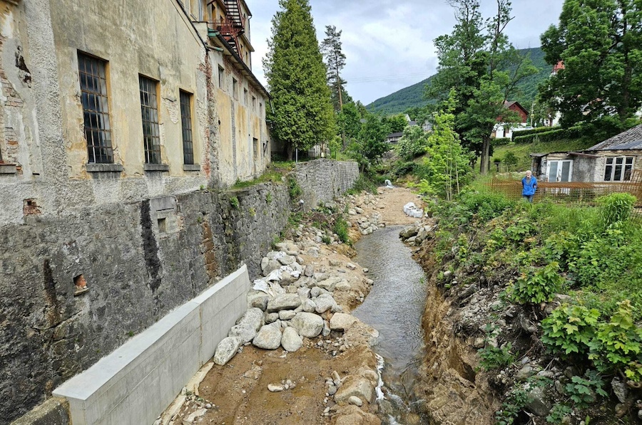 Letos se pozornost přesunula na budovu číslo 301, která se nachází vlevo od mostu. „I ta měla narušenou statiku kvůli špatnému stavu základů a historické výpusti z náhonu pro turbínu. Stav byl vyhodnocen jako stabilizovaný, ale vyžadoval okamžitý zásah,“ vysvětlil Mikulička a zároveň dodal, že základy byly vyčištěny až na únosné podloží, zpevněny betonovými pasy a vyztuženy ocelovými koši. Pracovalo se – za pečlivého odvedení vody mimo konstrukci – pod úrovní koryta řeky.