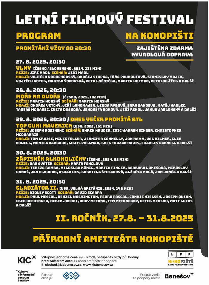 Promítání začíná každý den ve 20.30 v Přírodním divadle na Konopišti. Vstupné je 99 Kč a vstupenky budou k dispozici vždy půl hodiny před začátkem přímo na místě. Pro návštěvníky je zajištěna bezplatná kyvadlová doprava mezi Benešovem a Konopištěm.