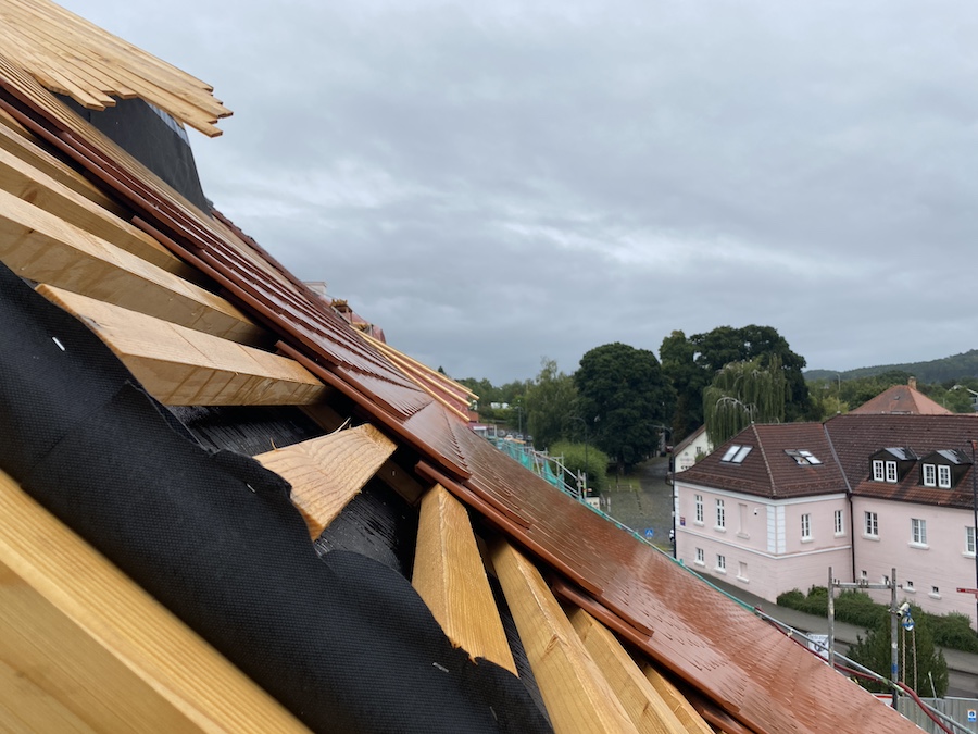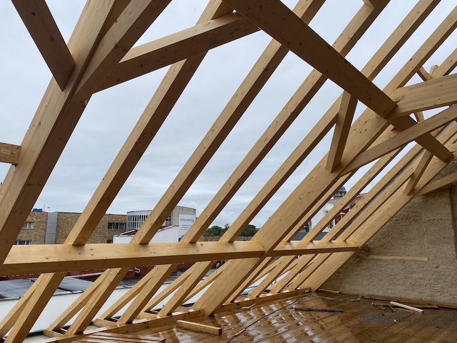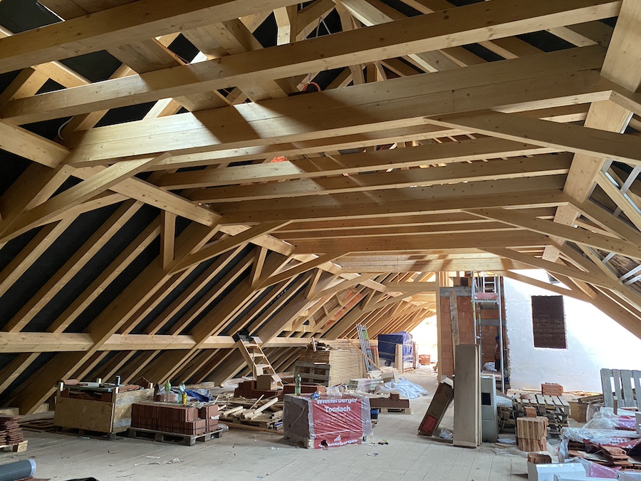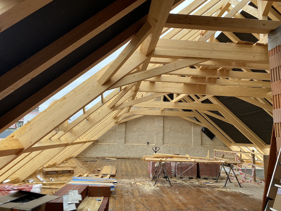 „Vzhledem k rozsahu tesařských prací jsme zvolili kompletní obrábění trámů na CNC a na stavbě už jsme krovy skládali jako z lega. Lepené smrkové dřevo věrně imituje původní tesařskou stolici a příjemně promluví do půdního interiéru. Ze stavebního hlediska bych dále vyzdvihl aplikaci tzv. polystyrenbetonu a pěnoskla, které jednak odlehčí níže položené klenby a jednak poslouží jako kročejová izolace,“ vysvětluje Aleš Kunca, vedoucí projektu z Metrostavu DIZ.